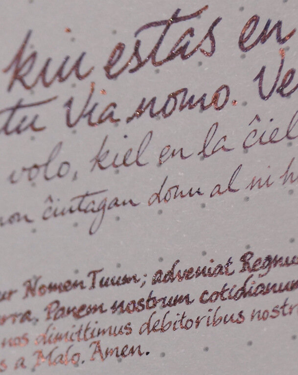 Sheen: Plenty of coppery red sheen exhibited by almost every ink mark