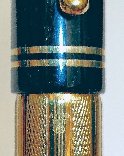 "Barley" pattern on the sleeve. "Au750""18CT""PF" engraved on it. Two cap rings and sleeve are made of 18 carat gold.