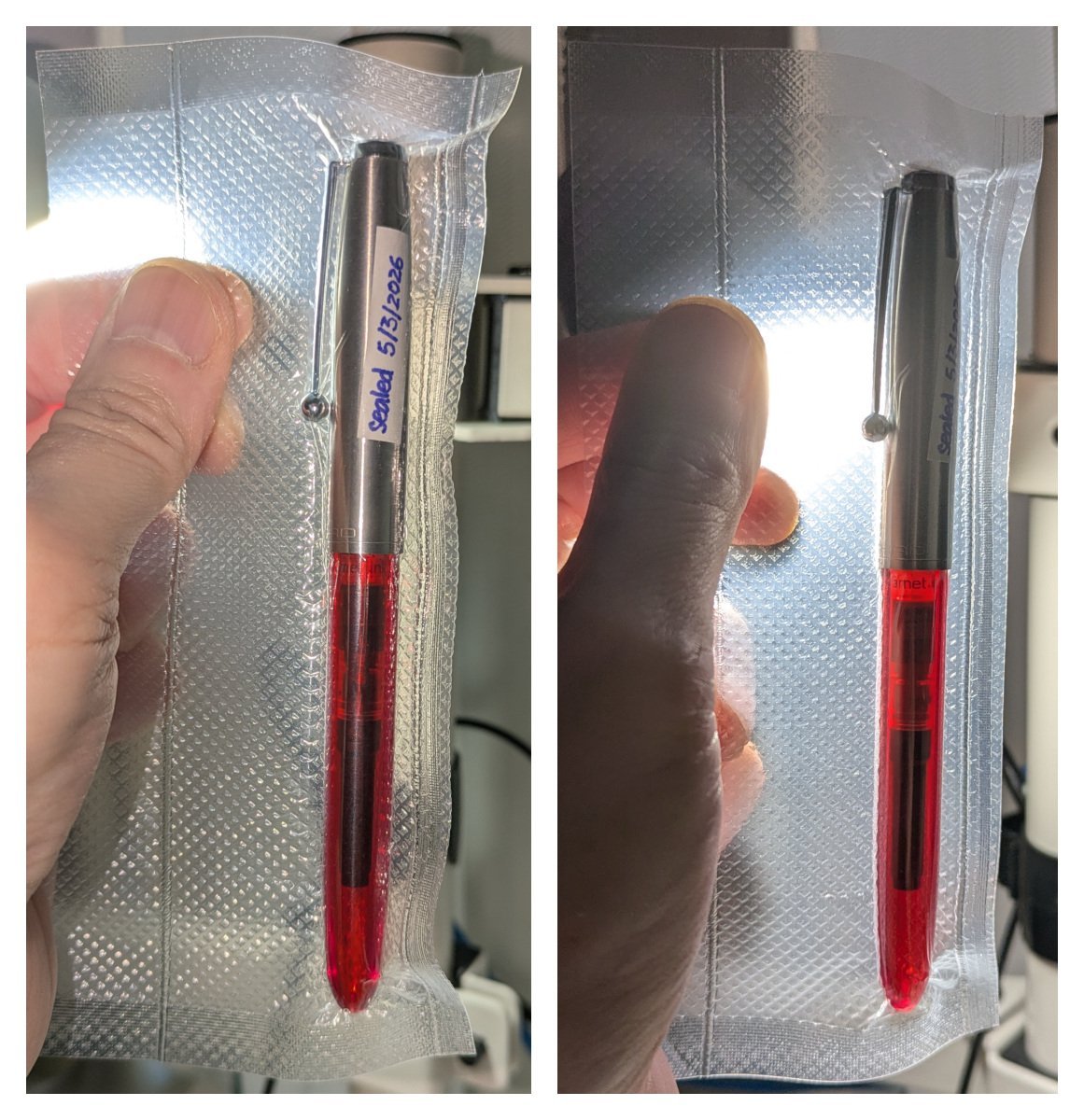 - whether storage of the pen in the vacuum-sealed bag would cause cracking, tearing, or other structural damage to the material of the pen body — at the extreme, I suppose it could explode, if the air pressure differential inside and outside the pen barrel is large enough and the material is fragile enough; and