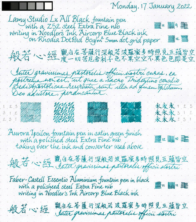 Same ink out of three very comparable European steel EF nibs. I think the widths of the contact surfaces on the nibs' tipping are not that far off each other, but the pens vary greatly in wetness. So, not only does the resulting line widths differ on the page, but the writing samples almost present in three different colours.