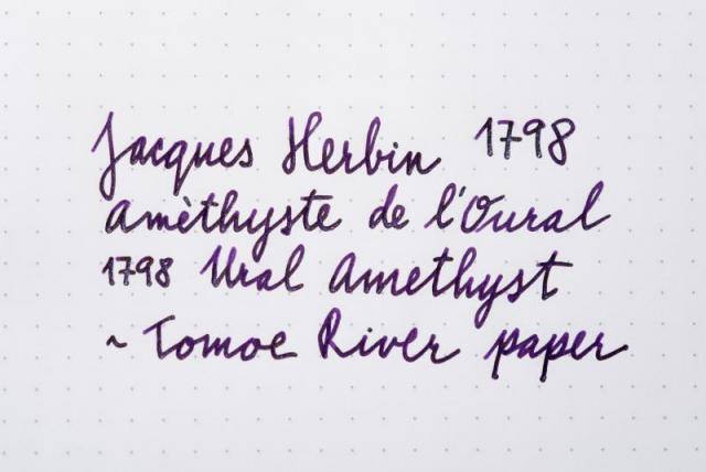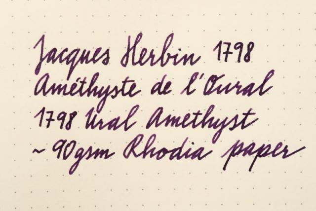 Hi folks, It's 2nd of August and we can finally talk about this amazing new anniversary ink I'll start it all off with official info first: The box is now a smart grey with purple label and white writing. It does stand out nicely on plain background. Overall design looks more mature and reminds me of perfume bottle packaging. Capacity stays the same - 50ml of silver sheen enhanced ink aka superink. J Herbin listened to feedback and changed the bottle neck - it has new, wider, 2cm opening. Thumbs up! The new bottle is slightly bigger, but the shape remains the same. Cap is covered in purple wax. A shiny looking scarf goes around the bottle neck and suits it very well. I wonder if Jacques himself was so lavishly dressed! On the front there's the 1798 stamp which ties up the scarf and a colour label underneath with the ink name - Améthyste de l'Oural. To finish it all off, the glass on the bottom of the bottle is embossed with Jacques Herbin and his mighty ship. ....And now for the ink itself Colour of Ural Amethyst is everything we wanted - regal, majestic, dark, mysterious purple. This is the first time J Herbin used silver particles - previous 1670 range of inks used only gold. The ink is amazing - the more I use it, the more I love it. I have left it in the pen for a week or so - there were no hard starts, pen started writing immediately. The particles move quickly and distribute very well. That said, the bottle needs shaking before inking (as usual) and turning the pen in hand before writing will make a huge difference to the shimmer. Now to the main point, how it writes... I did some comparisons with other purple inks and paper from Rhodia, Leuchtturm and Tomoe River. You will hardly notice the green sheen, that is mainly just eye candy from using special paper. As always, the shine does depend on the viewing angle and light source etc but the silver effect is superb though - highlighting the dark tones of the deep purple body beautifully. I think I've fallen in love again... Official release day is 1st September 2017. What do you think? Will this ink top the popularity of Emerald of Chivor?? Enjoy