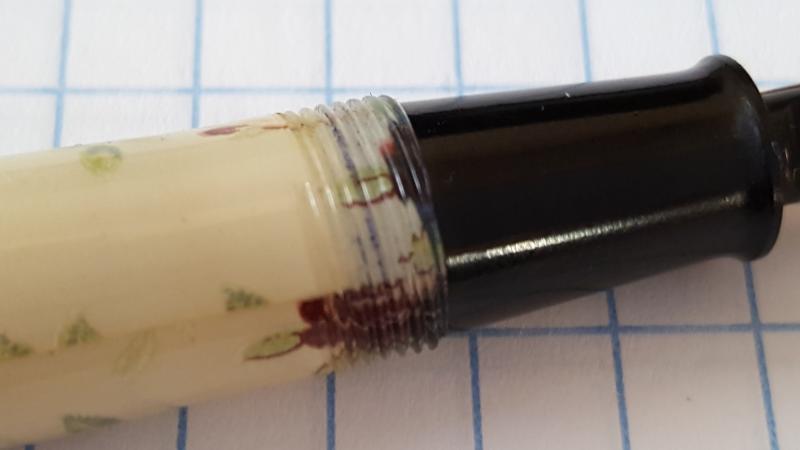 Hello FPNers, I am seeking some help/advice. I recently acquired a new Conway Stewart 22 with, generally, no discoloration. However, it appears that at some point in time, ink has seeped under the celluloid between the section and the barrel and left a very small stain. Knowing the 22's aversion to water, I am concerned about attempting any type of cleaning. Thoughts or suggestions? -Propman-