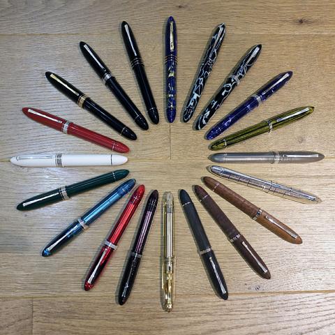 Hello everyone - long time lurker, (almost) first time poster here. In memory of OMAS, I thought I would take - and share - a picture of my 360 collection... missing from the photo are only a clear demonstrator and a second ebony pen. What the sharp-eyed among you may have noticed is that these, apart from the Imagination, are all rollers! I like writing with them, and since I prefer rollers to fountain pens, this has dictated the direction which the collection has taken over time. Clockwise, from the top: - Lucens (gold trim) - Wild (Ltd Ed) - Wild - Blue cellulose - Burkina - Titanium (not numbered) - Imagination - Snakewood - Snakewood - Ebony wood - Translucent Amber - Translucent Smoke (Ltd Ed, ruthenium trim) - Translucent Red (Ltd Ed) - Translucent Turquoise (Ltd Ed) - Green (Omas 75th) - White (Omas 75th) - Cranberry - Blue/black (gold trip) - Blue/black (HT trim) - MoMA A few versions are still missing, but I am hoping to still be able to add those at some point... You can see a larger version of the picture here: https://dl.dropboxusercontent.com/u/92915341/360large.jpg