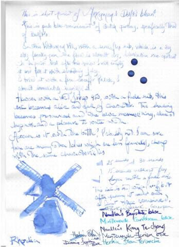 Akkerman Delfts Blauw This is short impression on Akkerman’s Delfts Blauw, inspired by Delft China... At first, I was not so impressed by the ink. It was almost too pale too bare. And it didn’t agree with my dry Waterman W2, though the only ink which agrees with this pen is R & K Verdigris. But after a couple of days it grew on me. Even in Waterman W2 it was alright. But the pen was still scratchy. It looks best in a monster Jinhao 450 with a fude nib. In my opinion it needs a wet wide nib. It’s a beautiful colour to use for this time of year, and with all the suffering going about, a soft blue is quite soothing….. Shading is again obvious with fude/wet nibs to a degree, but it dries to a soft muted color, as you can see. Faint sheening only with the fude nib on Tomoe River. Dry time is decent, flow wet but not lubricated. Though it made my Stub TWISBI less scratchy You can write non ephemeral texts with it, without fear. It will survive accidental spills, but I won’t sign a check or write an envelope with it. Personally, I prefer small bottles of inks. But the packaging is simple, understated, with an antique teal to it. I would suggest a sample for those interested and many pens to try, test and enjoy…… Part I Day 1 Rhodia dot pad: Amazon fountain pen unfriendly copy paper Tomoe River Water test - Rhodia Before After