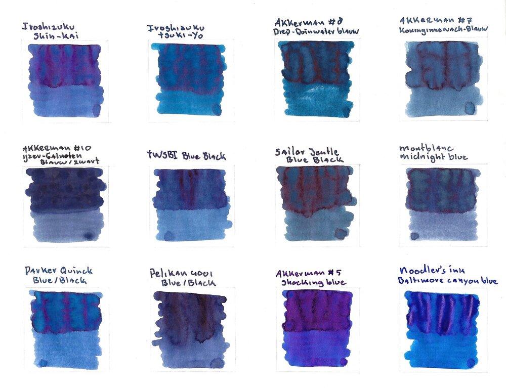 Here are 10 blue-black(ish) inks and two “true” blue inks as a comparison. Just for the fun of it. I scanned the sheet and with that most of the inks don’t show their sheen (or it’s not that obvious in the scan) so here are some photos of the inks to showoff some sheen: And for those of you who care about water resistance of inks, here are the inks after 15 seconds water bath:
