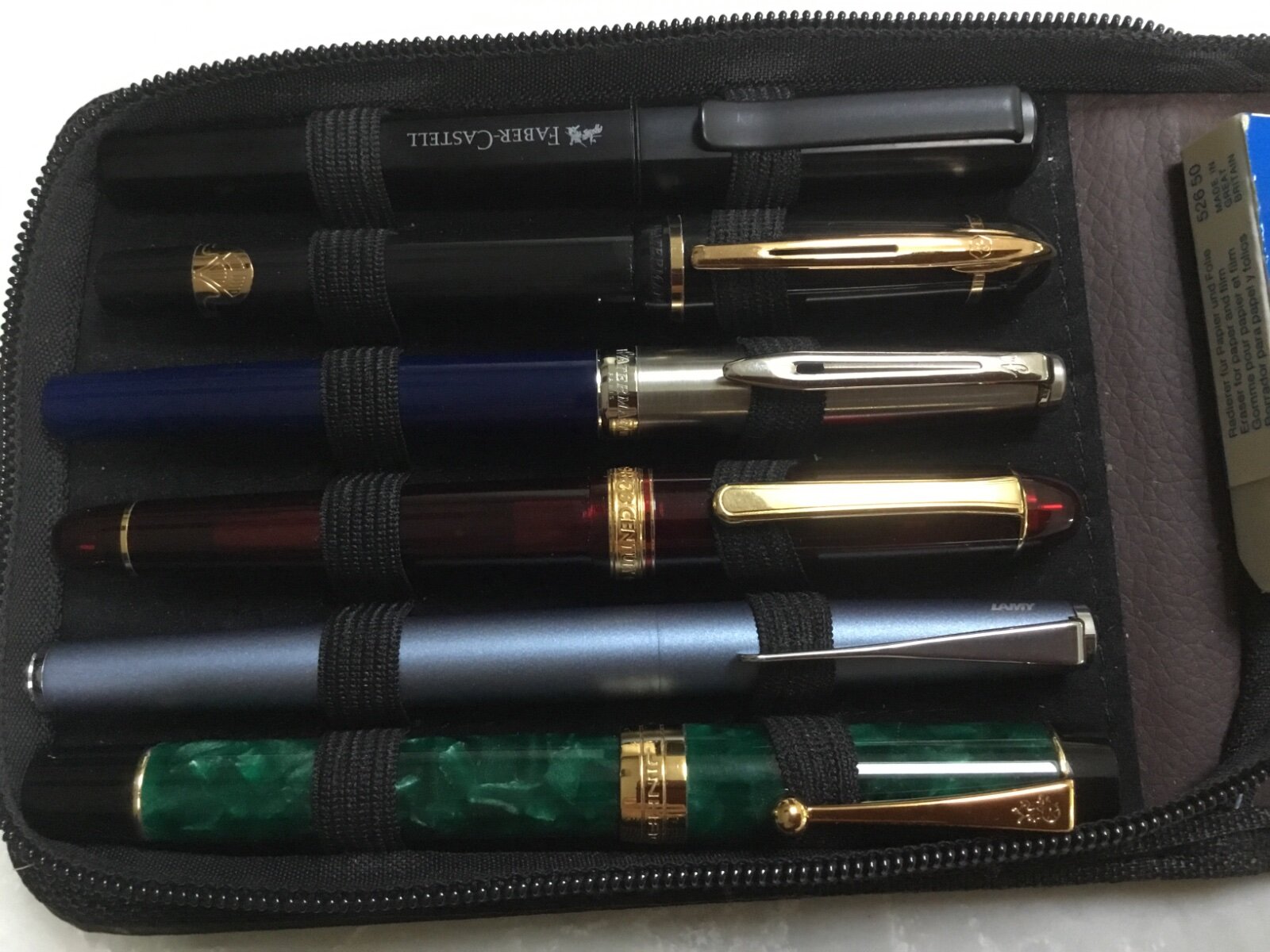 I have, I think, just completed my baby collection of pens etc. with a Retro 1951 rollerball. Apart from a Kaweco Sport EDC (kept in a Kaweco tin), I have six ‘standard’ fountain pens and six ‘other’ writing instruments, of which 2 are FP demonstrators and one is a semi-retired Sheaffer Prelude FP (gift). The ‘standard’ side The ‘non standard’ side The second group includes a Sheaffer ballpoint, a ‘Kerry’ mechanical pencil and the rollerball. Here is the rollerball on its own: The ‘Tornado by Retro 1951’ “Albert [Einstein]” in all its glory. My Tornado came from Cult Pens UK and so was very well packaged, arriving in a sealed dedicated cardboard box-cum-stand, with instruction booklet. I even got a promotional Retro key ring thrown in, along with the trademark Cult Pens sweets! The pen is all-metal construction and so fairly heavy. The action to extend and retract the rollerball itself is smooth and consistent, if somewhat heavier than my Sheaffer Prelude ballpoint. In the hand, it is slightly top-heavy: not an issue for me, but it could be a problem for someone with small hands. It is tapered to enable comfortable holding, but this is not as well achieved as, once again, the Sheaffer, which is always a pleasure to hold. By contrast, with the Retro 51, after a period of intensive writing (to test it) I found my hand becoming rather fatigued. This is not a major issue for me, as I bought it mainly for use on envelopes and in situations where a normal fountain pen might end up smudging - or worse. Extended writing is not really on the agenda - that’s what my fountain pens are for! The supplied OEM (Schmidt) rollerball is surprisingly good. I’m strictly an F or EF sort of person with fountain pen nibs, but this M rollerball was lovely. Smooth, no skipping* - even with Clairefontaine paper - and no feathering or bleed through to speak of, even on cheap and nasty paper. I was pleasantly surprised that the ink, once dry, tolerated being wiped with water-soaked tissue paper - there was some greyish smearing but the writing remained perfectly legible. Overleaf, on the same piece of paper, there was quite a lot of bleed through from the wetting, but that is not surprising. So, not ‘waterproof’, but certainly ‘water-resistant’ enough for use on envelopes, unless they are going to the Tropics! From my perspective, this rollerball makes a nice decorative and very practical addition to my modest collection. * I write with an angle of about 30 degrees, using very little pressure. Mostly cursive script, but not textbook perfect (i.e. never lifting the pen). It would seem, from a few experiments, that many variations on these conditions do produce significant skipping on some smooth papers, so Caveat Emptor.