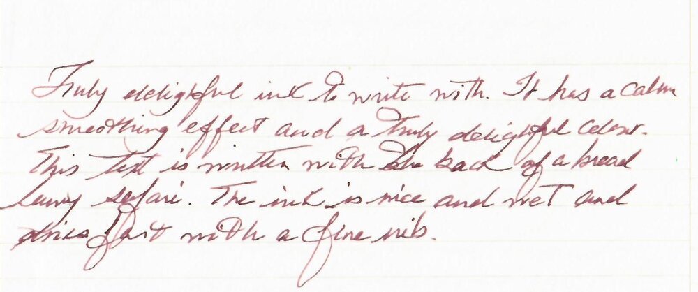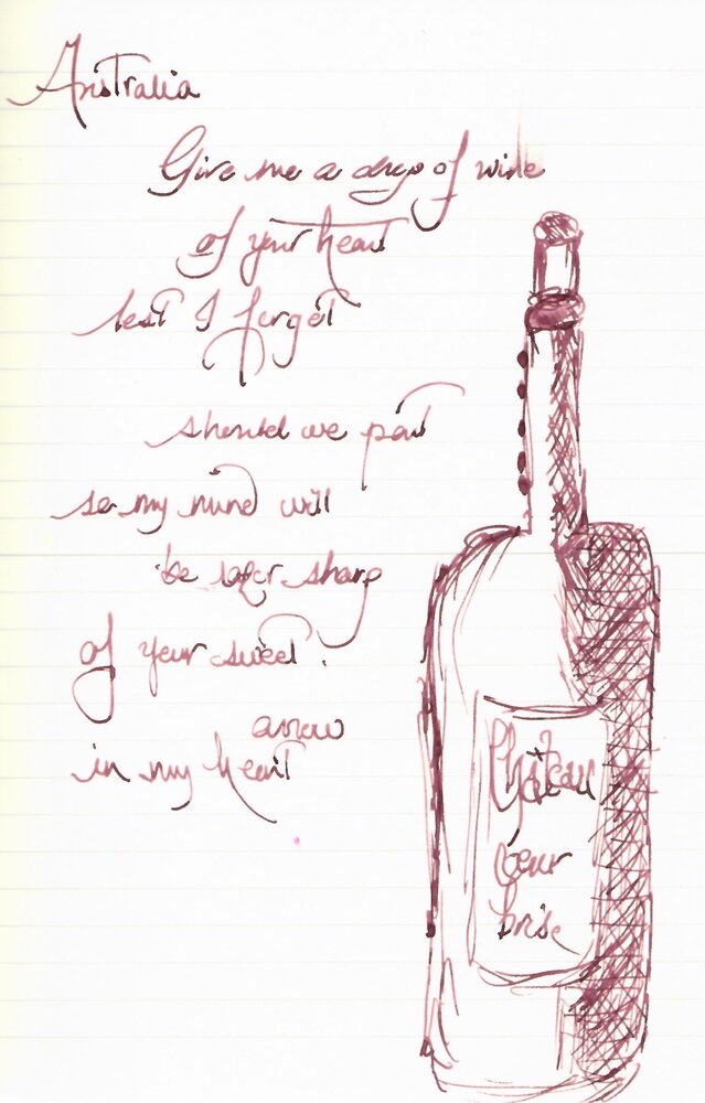 Super5 Australia Pigmented inks made by Rohrer and Klinger fo Papierlabor . They are lightfast and waterproof and designed for sketching, just like the sketchINK by R&K. The naming of this line is a bit haphazard, you can judge for yourself: Atlantic Australia Darmstadt Delhi Dublin Frankfurt They also have line of pens. The pens have a very good seal and the inks don't dry out in them, from what I've read. They are a shade darker in my experience of their sketchInk counterparts. Australia is shade darker than Jule and wetter. Australia is a nice wet ink. Dry time is the same as sketchInk inks. Meaning, if you use broad/flex/wet nibs and ink resistant paper the dry time is about 30 seconds or more and if you use F/EF nibs then you’re good. The price, however, is three times the amount of sketchInk. Very expensive for what is. • Pen used: Lamy Safari – Broad nib both sides • Shading: Yes with wider nibs • Ghosting: None • Bleed through: None. • Flow Rate: Wet • Lubrication: Nice • Nib Dry-out: Depending on the pen. Needs well sealed pen. • Start-up: If not used it can dry out, in pens with high evaporation. • Saturation: Saturated • Shading With wide/ flex nibs • Sheen: Not rally. • Spread / Feathering / Woolly Line: None. • Nib Creep / “Crud”: None • Staining (pen): You might need a pen cleaner. • Clogging: Yes, if pen is not well sealed. • Water resistance: Waterproof • Availability: Only in bottle 30 ml bottles. Chroma: Midori Midori with an attempted sketch... The colour reminds of wine Broad nib full galore.... and inky experiment...on TOmoe River 68 gr Australia