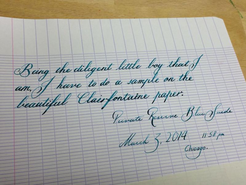 A while ago, I posted a pretty scathing review of Private Reserve Blue Suede, complaining about pretty severe feathering. Well, I want to revise that somewhat because I think those results were very pen-dependent. I just tried writing something with my new Waterman frankenpen, and the ink performed very well on the cheapest "99¢ for 200 sheets" American filler paper ever made. I bought this stuff ages ago. It's thin, uncoated, and everything but see-through, and the ink performed spectacularly. Of course, I had to try it on my best Clairefontaine, and the results…took my breath away.That's a money shot, people.