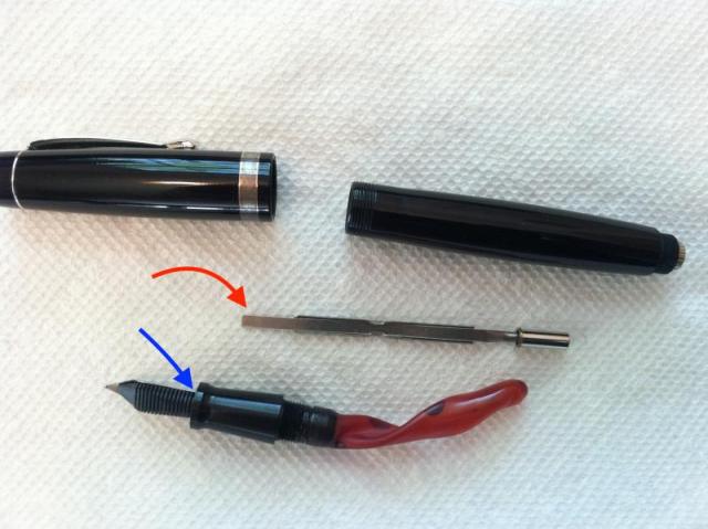 Hello, I took apart this old Filcao that was in my box and gave it a really good rinse this morning. Although I did pay attention to the disassembly, I have a few questions about reassembly that I cannot find answers to here or elsewhere on the web. 1. In the picture, where the red arrow is pointing, where and how does that get seated? Or is it just insert button/spring, screw on the section and hope for the best? 2. What would in fact be the order of re-assembly and does the spring have to face in a certain direction? 3. When I pulled the section apart from the barrel, the sac seemed wrapped around the internal spring, but after rinsing the sac seems to have flattened. How to re-assemble? 4. Last, ink seems to flow a little too much from where the nib inserts into the section - blue arrow - like, there will often be a small drop of ink sitting there - is it just me or is there a way to stop this? Okay, maybe I didn't pay *that* much attention during dis-assembly. Thanks so much!