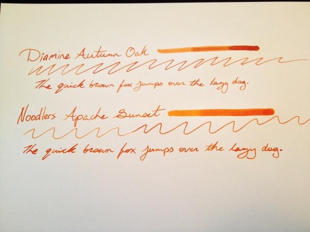 Hey everyone, Cybaea did a fabulous review on the recently released Diamine Autumn Oak (which is gorgeous and is worth a look) And when I saw it for sale at Stylus Pens in Edmonton this weekend I decided to pick up a bottle to do some comparisons. So here we go! Noodlers Apache Sunset and Diamine Autumn Oak here is a quick review of NAS here is a quick review of DAO and here they are side by side (not the best quality, I took these with my phone camera) So there they are. My thought is that they have very similar reddish properties but the yellow is brighter in NAS, whereas the yellow in DAO is more earthy and orangy-brown. But very similar! What do you think?