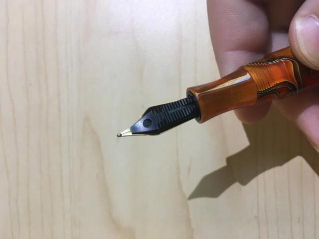 I was on a business trip and ordered some penny goodness in the form of a Edison Collier Persimmon Swirl, with an 18kt B nib. I also got a sample of sheening inks. It is a beautiful writer and the nib is gushingly wet. I’ve been playing around with the different sheening inks; both Iroshizukus, J. Herbin’s Emerald of Chivoir, and the Diamine Majestic blue. Maybe I’m doing something wrong, but even with the super wet nib on Rhodia or Tomoe River paper, I only see the sheen in bright, direct sunlight. The Persimmon Swirl is beautiful, looking bright orange to a dark red, depending on the light. I bought from Goulet and they did a great job packaging the pen with lots of bubble wrap. Here’s a picture of the Collier and how it writes: Close-up of the pen body: And the nib: I am really enjoying this pen. I like bold nibs. Mediums are great for everyday use, but for letters and cards, a wet bold nib feels so much better. -