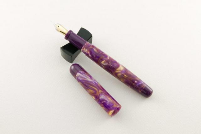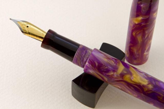 1. It has been a while since I posted pictures of fountain pens I have completed. Here are a pair, done in purple and gold Flexigran, but different in style. Neither pen has a clip because clips were not desired. On the smaller pen with the rounded finials, I worked with Bob Dupras to come up with a solid alumilite color close to but not exactly the same color of purple of the Flexigran. The section of that pen is done in the same alumilite. The other larger pen has the single finial done in Italian resin. For those interested, the Flexigran and the Italian resin both came from Richard L. Greenwald.