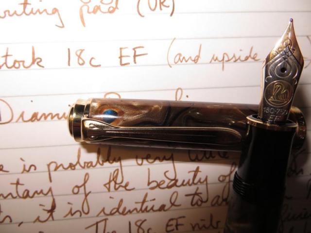 "Pre-order it, and it will come." With apologies to all. Pre-order it I did, and came it did. What a beautiful pen - and what an understatement. Granted, I'm still on the pen honeymoon, but this pen has converted me. I used to think that a fountain pen could be any colour, so long as it was black; the user's individuality could be hinted at by opting for either gold or silver trim. Boy was I wrong. The Pelikan M800 has opened the doors to the world of swirling acrylics and maybe even celluloids... This is my first review and I haven't yet landed on my standard style of review...there is no running commentary of the unwrapping ceremony, and no photos of me shaking hands with the FedEx man when he delivered the pen. In a nutshell, this pen is functionally the same as any other modern Pelikan M80x. The difference lies in the pattern and colours of the barrel, to which my description can hardly do justice. If you appreciate the writing experience of a Pelikan M80x, and you like the aesthetics of this pen, there is really little more to say than "happy hunting." This pen has decisively wiped the M800 Tortoise from my grail list. P.S. Diamine Raw Sienna matches this pen wonderfully!