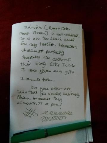 Has anyone else had difficulty deciding whether or not to hold onto an ink because the ink works for a pen but not for personal aesthetic value? I was lucky enough to be given the Estie Icicle pen shown below; I inked it up with a sample Robert Oster that looked close to the pen color. I am pleased with the pairing of ink color to pen color (see attached photo), but not with the ink color itself; I tend to prefer deep rather than smoky colors of my ink. Now I'm at my wits end deciding whether to keep this nice pen inked with a color that suits it, or change it to a color that suits me. I do realize this is a rather superficial problem to have, but it irks me nonetheless. Anyone else similarly torn?