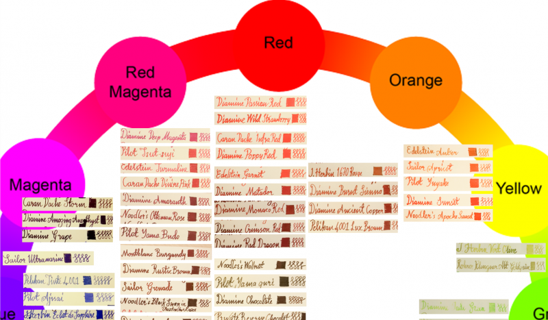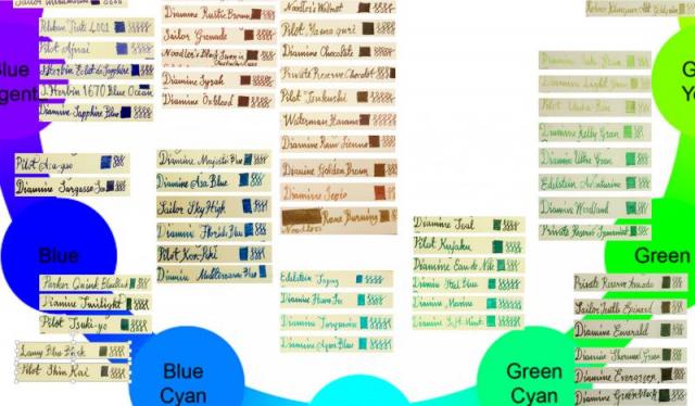 I tried to create an ink wheel. It is not 100% perfect but it at least gives an idea about where each of my inks fall on the color wheel. The original file is in powerpoint format and 10MB. So, posted screencaptures as png files. First picture is the whole wheel. The rest are closeups...the color samples are obtained with a dip pen and the paper is daler rowney sketch paper (100g/m2). You can find more detail on how I obtained the samples with dip pen on my other post "color samples"....let me know what you think and more importantly enjoy...