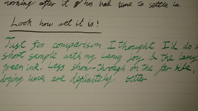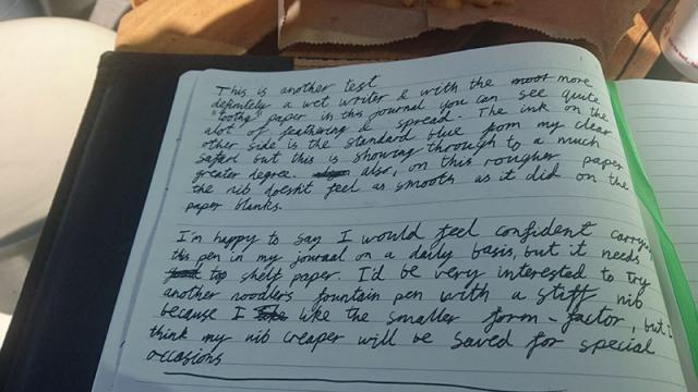 Noodler's Nib Creaper, Jade: A day in the life. . . For me, writing on the move is a must. My journals need a hard cover, my pens have to put up with a lot of jostling, motion, and the occasional hard stop when I put my bag down too roughly, and given the hit and miss reputation Noodler's pens seem to have around here I thought the perfect way for me to review a Noodler's pen, as a fountain pen novice, was to take it out and about, and see how it behaves compared to my other three pens. So I filled it last night with Black Parker Quink (because you can't get more basic than that), wrote a test piece in my paper blanks journal (which are worth every penny of their hefty pricetag, let me tell you. I will review them soon) and you can the results for yourself. You can see from the sheen on the last line just how wet it is, that took a good two minutes to dry out. Just to compare I took my Lamy joy and scribbled a short note below this one and. . . Given how smooth the paper blanks paper is I figured that it would have an effect on drying times, but the Lamy ink was safe to touch after about 8-12 seconds. Obviously a flex nib is going to write wetter than anything else, but the disparity in drying times was huge, especially since my Berea Navigator has used the same ink on all sorts of paper and gotten sub 12-second drying times. So anyway. I let the pen sit overnight, level on my desk, because I wanted to check for seeping and when I returned to it a scant eight hours later this is what I discovered. You can *just* see the ink seeping around the sides of the feed and clinging to the wings of the nib. Seeing as how I was on my way out, I topped up the reservoir and this time, instead of leaving the reservoir full I squeezed two drops back out, wound the piston up and cleaned off whatever I could see from the underside of the feed. I was reasonably confident by this point that I wasn't going to have any problems, but I slipped the pen back in the little cellophane pouch it was wrapped in inside the box and stuffed that in the pen loop on my journal cover. still a tighter fit than a ballpoint or an artline 200, but better than a Lamy (I can only fit the clip through the loop. Just). My journal cover also likes to travel in style inside my "leather" messenger bag, which I've had for so long it's bound to fall apart any day now. I've lefth bot my Safari and my Navigator laying around in here for weeks with no issues, so I want to see what a Noodler's pen will put up with, and after a trip to the station, a train ride, a hurried walk through the city and a bus ride we see. . . Not much difference. There was also no ink in the cap, but I couldn't get a decent photo of that. If a nib creaper can handle me running around, dodging and weaving through crowds, and even dropping my carry bag twice, then I don't think that it's gonna leak. Writing on the rougher paper though definitely has its drawbacks. You can see in the closeup that the ink would chase long fibres across the surface of the paper and the show-through was almost legible on the other side. All in all I'm quite happy with this pen, but it definitely needs good quality paper and I don't know how I feel about paying 30 bucks a hit for everyday journaling. I would happily keep this for letter writing and signing things, and I would love one of these with a standard nib, but the flex and the wetness are things I would still have to learn how to use. One impression I got through using the Nib Creaper on good paper was the tactile memory of journaling on a moving train with an Artline 200 felt tip. A wonderful experience that recalls days where I would have to fight the urge to just stay curled up in my seat and just keep writing away for hours. Summary: ______________________________________________________________________ Appearance & Design (7/10) - Love the colour! The colour range in Noodler's pens is fantastic, and I love the marbled colour contrasts. I have never "ooed" and "aahd" so much over a writing implement before. I love the smaller form factor Noodler's are working with and I will definitely get another one. Construction & Quality (7/10) - You feel the price, but you get a lot for it. Cheap doesn't have to mean bad, and Noodler's have certainly proved that point. While it is certainly more colourful than your standard array of ballpoints on the shelf at officeworks it still leaves me with this kind of impression. Yet, in spite of this it has already proven that it can handle my day-to-day routine without spilling stains everywhere. Weight & Dimensions (9/10) - Long, slender, and lightweight Capped: 131mm Uncapped: 118mm Posted: 140mm Weight: circa 20 grams Nib & Performance (7/10) - Wet and smooth, but a little scratchy on cheaper paper Getting the tines to flex takes less pressure than you would think, I was having some trouble with starting on some down strokes, and experimenting with different holding positions and angles didn't seem to help any. Also: on my cheaper journal paper there was definite bleed and show through due to the wetness of the write, and the nib felt a little scratchy. That said, it was only a matter of a few millimetres each time the feed wasn't dry simply starting at times seems to require a little flex now and then. Filling System & Maintenance (10/10) - Classic reliable piston filler moving the piston the first time was a little stiff but ever since the piston mechanism has been easy to use. Taking the time to leave a little room in the reservoir seems to have headed off any potential worries with ink bleeding out the feed. Even as someone who has a preference for converters I have zero complaints. Cost & Value (9/10) - Cheap and exceptionally cheerful! At 16.10 USD (plus postage) from Goulet pens, if you're looking to experiment with a flex nib you can't go wrong. Conclusion (49/60) - I am going to take this pen on more adventures. Next weekend I am going to take my Paper Blanks journal, and go for a l