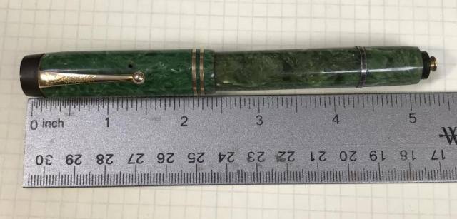 Hi Guys i have just today purchased this jade duofold jr. This will now be my third duofold jr however i have not seen these pens with comb feeds except where the nib has been replaced with a newer vacumatic era nib. That being said i do remember remember reading that parker started to phase out the christmas tree feed in 1928 which would be the right time period for this pen. I would love to here your thoughts on this. Can't wait to get this one cleaned up and ready to write! Thanks