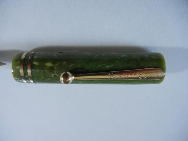 My wife's father passed just about 25 years ago. In a box of 'stuff' that one of his daughters kept, this pen turned up. (see below for images) I took it apart, replaced the sac, and put it into working order. It is priceless to my wife; being able to hold the same pen that her father used working a milk truck delivery route in Pittsburgh, Pa in the pre-WW-II time frame is very special to her. I seek a little more information. From research I have done, I have determined that it is a jade Lifetime Flat Top White Dot. According to an article on Pen Trace that I found, the clip puts it sometime after 1922. The white dot puts it sometime after 1923, the serial number on the nib (0396277) puts it sometime after 1926. My best guess is that it is circa 1928, give or take a year either way. I tried to get a picture of the inscription on the barrel, but failed to produce anything I can post. The inscription reads: W. A. Sheaffer Co. Pat AUG 25 08 Fort Madison, Iowa USA DEC 10.12 - JAN 27 - OCT 20 - NOV 24.14 The double band seems kind of unique; I haven't found many images of a pen of this size with the double bands on the cap. My questions: Do you agree with my identification of its age?It is a short pen, as you can see from the photo. Can anyone tell me anything about this size? What term would Shaeffer use to describe it?The pen is not for sale, but I am curious about the value. My best estimate is about $75 to $100; does that sound accurate?As far as the lifetime warranty.....it writes like a champ. I'm kind of proud of my repair job. :-) Here are some more pictures: