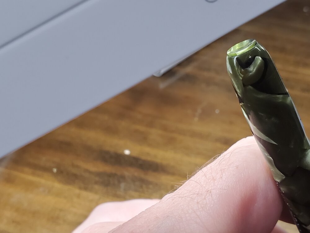 I recently acquired an emerald pearl streamlined standard second generation vacumatic. At first I thought the blindcap jewel was black, but on a closer look it’s machined from the emerald pearl celluloid, but not in the usual orientation. Is this a common thing? I'll attach some photos, but it’s difficult to capture and it’s visible only from a shallow angle.