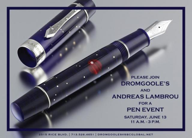 Join Dromgoole's for a Pen Event with Andreas Lambrou. Saturday, June 13, 2015 11a.m.- 3 p.m. 2515 Rice Boulevard, Houston, TX, 77005 Larry: dromgooles@sbcglobal.net 713.526.4651 See you there! -