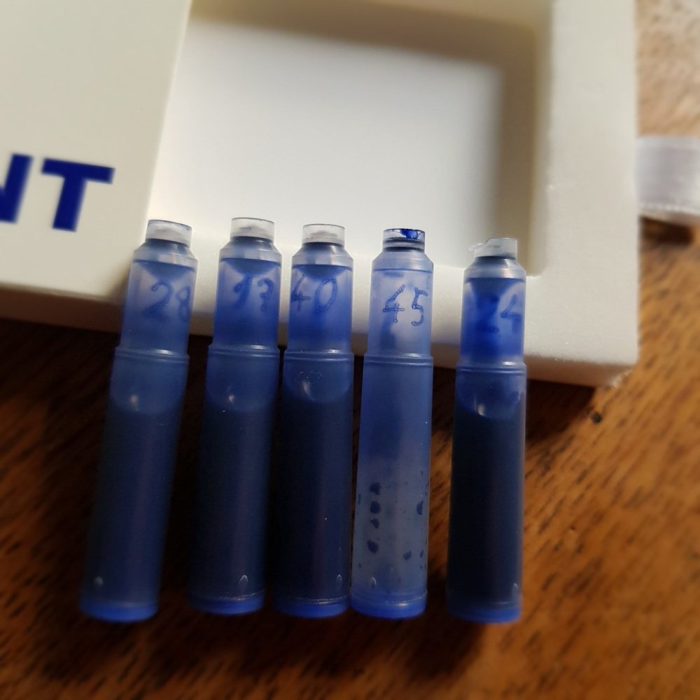 I bought this package of Mb Permanent Blue probably in 2014. Sticker says best before Nov15. I'm finally using them, just emptied one cartridge, and noticed...a message? The number 45 written inside the cartridge. I examined the other cartridges (see photo). The three on the left are unopened. All different numbers. Can anyone explain why these numbers were written inside the cartridges? And what they mean?
