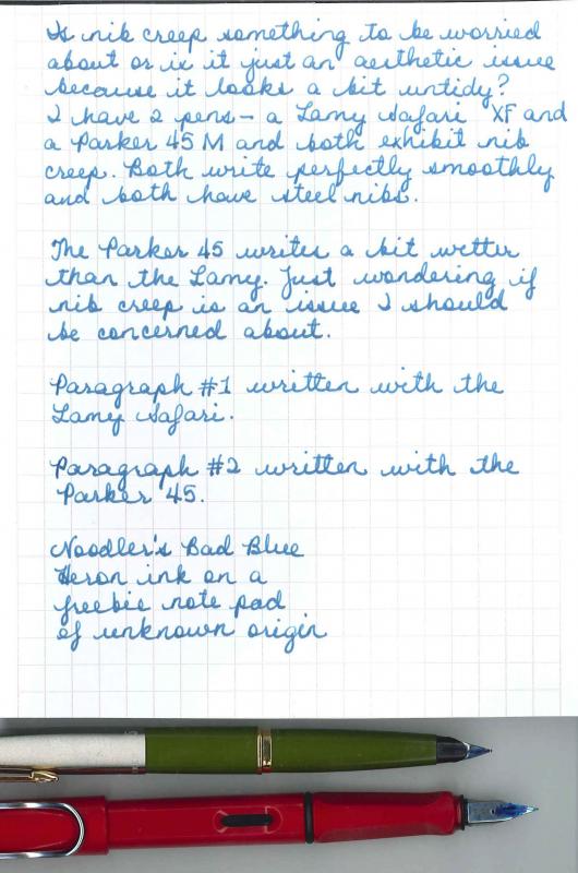 Not really any specific point. Have just noticed a vast array of opinions on nib creep. Some people really get bothered by it, others don't really care. It's said it doesn't effect the performance of the pen. Just more of a visual thing. Do you downgrade a pen slightly or an ink if it tends to have nib creep? I know there are quite a few people who do. Just thought it would be interesting to throw it up and see what everybody's thoughts were. Personally I don't really mind it unless it's something outrageous. -