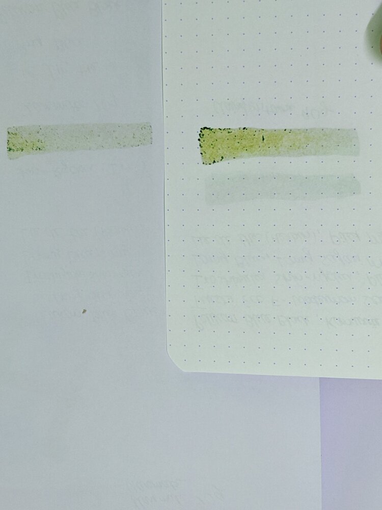 I just got some rhodia blank a5 pads and clairefontaine dot age bag. I wasn't thrilled with their result. So I did a comparison between the paper that I am currently using and the Rhodia. Left is rhodia blank a5 80g orange pad cost (Rs 300 for 80 sheets) and right one is Classmate Project Paper 70g (A4 loose leaves, double punched, cost - rs. 45 for 50 sheets).Rhodia is made in France. Classmate is manufactured in India. The big swaps were made with a spoon that I found in kitchen using Iroshizuku Shin-ryoku. My conclusion - Smoothness - Rhodia is a bit more smoother to write with but not too much. Shading - I cant conclude, shin ryoku seems to have a shade tad bit more in classmate and less in rhodia, will need to test more ink to conclude. Sheen - I am a noob in this department but the swap with spoon took 4-5 times more to dry in Classmate. There is a layer formed in classmate too where the ink dried slow (top left), this is less pronounced in rhodia. Ghosting - very slightly but more on rhodia, very minor can write on back easily on both. Bleed - In normal writing none, but in ink swap the Rhodia showed considerable high amount of bleed, It even showed on the back of the paper it was on. I was very much impressed by the classmate overall. Rhodia vs Classmate (front) Rhodia vs Classmate Rhodia vs Classmate (back) Edit - added comparison with clairefontaine. Here is comparison of Classmate Project Paper 70g and Clairefontaine 90g Age Bag. Kindly ignore the upper swap done on clairefontaine, I kind of messed up there. Conclusion - the iroshizuku still shades more in classmate, but lamy blue is shading in clairefontaine which is not pronounced in classmate. On bleeding and ghosting the classmate is clear winner but only by slight margin. Smoothness in clairefontaine is more pronounced. Overall, I am quite happy with the clairefontaine compared to rhodia. But for the price the classmate is clear winner, the pages are not as smooth as but they are not bad by any means. Kindly note that the pages in project paper of classmate is different from the pages found on their notebook. I don't like their notebook when writing with fountain pen. Classmate vs Clairefontaine (front) Classmate vs Clairefontaine (back) Sorry for messed up editing, this is my first post. -