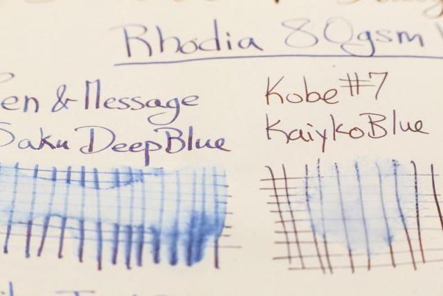 I became aware of the world of fountain pens (other than Montblanc) through Goulet on Youtube earlier this year and got sucked in. I write a lot so initially this was all justified, but now its clearly gotten out of control. Goulet no longer sell Sailor, so it took a couple months, but I then became aware of Sailor and how supposedly great Sailor inks were. Of course it was not long after that I became aware of their special store inks. I also found out that I missed out on when Sailor was offering the old style tall bottles more commonly with their regular inks, and everything I was buying now comes with the short stubby ink bottle, which is boring at best. I do not think the short bottles should be used on Sailor's inks which tend to be more expensive. Anyways, a goal of mine has been accomplished, I have acquired Pen and Message Saku Deep Blue in the old style bottle. I love the look of the bottle, but as so many have stated the cap can get stuck. I would have to say Pelikan Edelstein make the best bottle I have tried: They look great, feel solid, they are heavy with a wide base and the cap always works. I have never tried the Akkerman bottle. Ok tangent over. I adore this ink so thats a plus as well. Overall I love this ink, the look, the feel, the sheen, how it behaves so similarly on so many different papers. I still cant pick a favorite blue, but this is definitely a contender. I don't know anything about the ink or the company, so I'll just skip to the photos and the review in the photos: I decided since I was taking photos I would take photos of all the pens and ink bottles I have acquired this year since starting my addiction, but I kept the focus on the Saku for this review: If someone knows what this says on the top I would appreciate a translation: I'm no calligrapher, I havent even read a book, I just looked up letters online, so be easy on the handwriting haha. Review on HP Premium Laser 32lbs: Written with an italic dip pen: On 68gsm Tomoe River Paper vs Kobe #7 Kaikyo Blue, Bungubox Omaezaki Azure Sea, Bungubox 4B, Sailor Jentle Blue, Diamine Midnight, Diamine Blue-Black, Kobe #38 Kitanozaka "Kitano Hill" Night Blue, MIXTURE: Sailor Kiwa-guro and Sei-Boku, Pilot Iroshizuku Shin Kai, Pelikan Edelstein Tanzanite, Lamy Blue-Black: Water-resistant testing on Rhodia:These inks do ok after being left to dry for about 12-15 hours, especially considering they are not marketed to be water resistant. It does appear that there is some component of the ink remaining after putting water on it for about 30 seconds. More on Rhodia with a Brause #361: Saku Deep blue written with an italic dip pen on 90gsm Optik Paper from a Black n Red notebook vs Sailor Jentle Blue, Akkerman #5 Shocking Blue, Organics Studio Nitrogen Royal Blue, Bungubox 4B "Bung Box Blue Black", Bungubox Omaezaki Azure Sea, Kobe #2 Dock Blue, Kobe #7 Kaikyo Blue, Kobe #14 Maya Lapis, Sailor Jentle Souten:- 10 replies