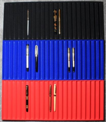 This is an initial review of a 60-pen storage case, named "3 in 1 Pen Display, Carry and Storage Case" (the "Case"), manufactured (I think) and sold by Penn State Industries ("PSI"). I have no affiliation with PSI or its owners or employees and have only purchased this and some other pen storage boxes in the past. This one I received last week, so this is an early review. I thought this Case would be worth a review, as, if it works as designed, it may provide a convenient way to display pens at pen shows; it displays pens at an angle, rather than flat, and "protects" the pens (from, e.g., quick theft) with an see-through acrylic cover that must be lifted to get access to the pens. The exterior dimensions of the Case are 17" x 15.5" x 4.25" -- in metric, approximately 43.19 x 39.37 x 10.80 cm. Here are photos I took of the case standing and laying flat. In the website's description of the Case, PSI incorrectly describes it as holding 64 pens -- 32 pens in each of two sections. In fact, when one counts the foam inserts' pen spaces, there are two sections that have space for 30 pens each, for a total of 60. Here is a photo of one of the two identical foam inserts. See my next post for more.- 5 replies