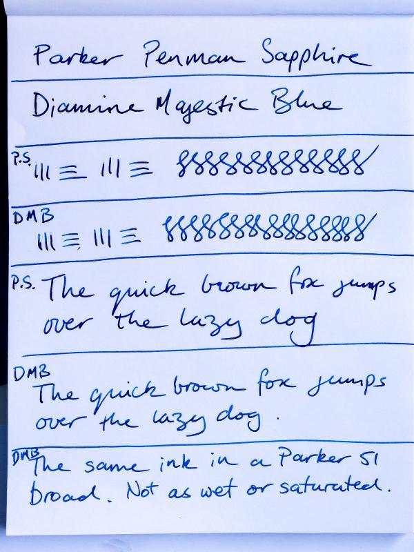 I recently picked up a few bottles of Parker Penman ink for what seemed like a bargain price compared to some I'd seen. The deal also included four vintage Pelikan bottles (the ones with the Mont Blanc style tip-fill well), which made it extra sweet. I tried each to see what all the fuss was about and it came down to just loving the Sapphire and Emerald. The Ruby was an odd browinsh color with a lot of sediment, possibly suffering from too much age. The Ebony and Mocha were OK, but not interesting enough and are currently for sale on flea bay Australia if anyone's interested. Wary of their reputation for clogging pens and not willing to risk any of my good ones, I inked up a couple of Chinese pens as testers for the the two I liked. They Sapphire rapidly became my favorite blue, and I tend to favor blues. I'm not much of a green user, but the Emerald is a really beautiful one in my book. My mind immediately turned to finding substitutes, both to conserve what I had and to replace them in the long run. According to what I read online, Diamine Majestic Blue was a good option for the Sapphire, so I bought a bottle. Attached is a side by side comparison, and it's not a bad match. The biggest difference is that the Diamine had a significant degree of red sheen not seen in the Penman. Otherwise the color, saturation and shading seems close. Both samples are with the same pen/nib - A Jinhao X-450 with a broad German Knox nib. The first line with the Diamine was just after I'd id inked the pen, so the ink load is higher than it would otherwise be, but it does show up the red sheen. The sheen is not as evident is subsequent lines. Paper is Rhodia 80gsm. I've attached images, which I home you find useful. My apologies for the chicken scratchings which pass as my handwriting. Mario -