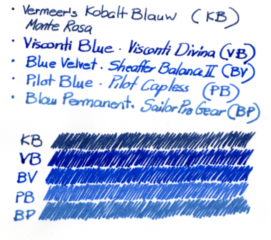 If there were a support group for blue ink addicts, I should attend the meetings. I just can't resist the blues. I already have more than enough but still keep buying and comparing them, always in search of yet another perfect blue ink. Until recently my favourites were Diamine Midnight (dark blue), Visconti Blue and Akkerman KoninginneNach-blauw (light blue). Rohrer & Klingner Blau Permanent fell out of favour when I discovered that it was rather too washable; pity, because it's lovely. After many months of sticking to the same inks (mostly to use up the ones that failed in similar comparisons), I took some of my most reliable pens and inked them with the new candidates. In the scan (which seems quite true on my computer), Akkerman Vermeer's Kobalt Blauw and Blau Permanent are used to define the boundaries of my search.The comparison is primarily between Visconti Blue, Diamine Blue Velvet and Pilot Blue. I had expected more from Pilot Blue. In comparison to the others it appears rather watery. Blue Velvet is impressively bright and clear, and when Visconti Blue is compared to it I can see a hint of a sheen in the latter. Not been into sheens, I therefore decided to replace Visconti with Blue Velvet. So I'm off to fill pages with the Pilot and Visconti blues. It's nice when one has to use up such good inks.