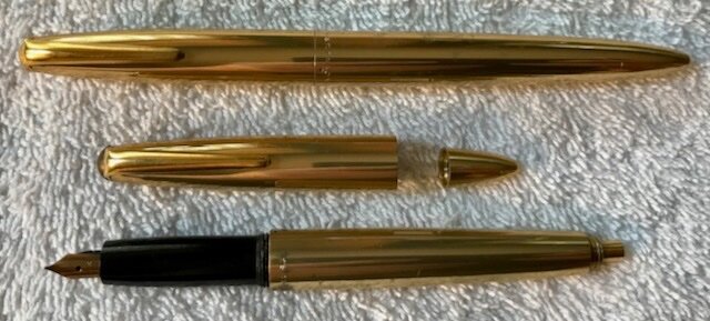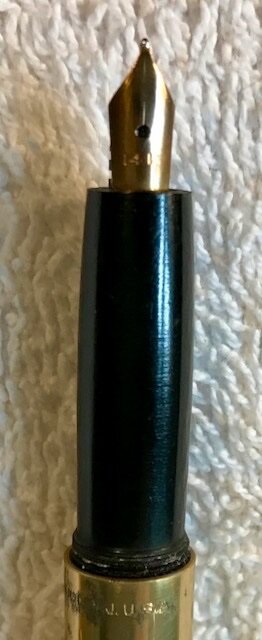 On Ebay, I recently purchased for less than $30 four Secretary Pen Company's "Executive Secretary" fountain pens, and two of that model's mechanical pencils. I tried to find a meaningful history of this company, but could not find it, even here on FPN. My impression is that this pen comes from the 1940s-1950s eras, and certainly no later than the 1960s. Each of the two pens in the best condition came with the pencils. One of those two sets is NOS, and the other is in good condition, especially after cleaning the ink out of the FP. The third FP fills and writes. The fourth FP's internal sac is rubbish now, thorough attempts at cleaning and ultra-sound make no difference, and I cannot remove the section from the body. Here are some photos of the FP only; the pencil looks as one would expect, but the turning mechanism seems to be the area surrounding the point: The most striking thing about this FP is its tiny, 14K nib. By analogy, one might "medicalize" its size with a diagnosis of "micro-nib." What matters, though, is how well it does or doesn't write ("the motion of the ocean" in a different context). I'll get to that "shortly." The lines of the pen overall are attractive. The exterior has a thin-layer of gold plating. The wording (not shown) at the top of the barrel, where it meets the cap, is: "SECRETARY PEN CO. UNION N.J. U.S.A." The cap screws off and on with 3 full turns. The FP weighs 17g and has a length of 13.4cm (5.25 inches). The tiny 14K nib is firm. This pen uses a button filler, which is found under the blind cap. The button looks gold-plated. I used the third pen of the group, which I cleaned thoroughly and let dry on a towel. I filled it with Sheaffer Blue-Black ink, just to be safe. The pen wrote immediately, but the writing experience was mediocre-to-fair. The very small nib is a bit scratchy, not terribly so, and the flow is on the dryer side, but also consistent. The overall writing experience is not pleasurable, but not terrible. I like the novelty of the pen because of the off-brand name, the button filler, and the tiny nib, and the price I paid for 4 (3 functioning) FPs and two functioning mechanical pencils (0.9mm lead?) was quite a value. If anyone else has experience with this model and/or other photos, please post. I'd be interested in hearing the views of others of you out there.- 4 replies