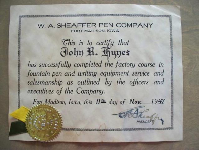 Hi Everyone.... I wanted to share this with you. I recently found this unique diploma / document. It was among a bunch of military documents. See attached photo of "W.A. Sheaffer Pen Company, Fort Madison, Iowa; This is to certify that John R. Hynes has successfully completed the factory course in fountain pen and writing equipment service and salesmanship as outlined by the officers and executives of the Company. For Madison, Iowa, this 11th day of Nov. 1947. Gold seal with ribbons and signed by Sheaffer, president. -