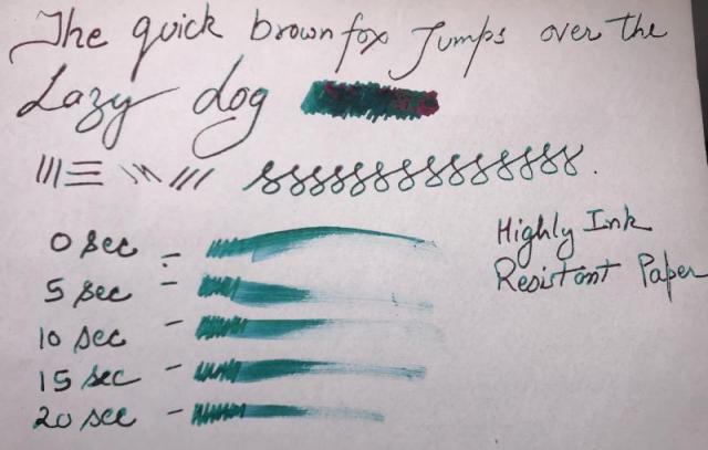 Comparison of two inks with a similar teal-like color, the Noodler's ink brands itself as a Blue-Black, while J. Herbin's is called a Grey-Green. Vert de Gris is very gentle and shades very well, while Prime of the Commons can be a bit temperamental on the page, but both flow very well. Prime of the commons is "Bulletproof, Eternal, Forgery Resistant and Waterproof", and will change it's color to a light blue when tampered with. I've got both inks and the Tomoe River Nebula Notebook at PurePens, so if you like them be sure to check them out! Great service and shipping prices to Brazil, where I live. Writing sample on a Nebula Notebook with Tomoe River paper, Noodler's PotC is on a Sailor Lecoule with a MF nib, and Vert de Gris is on a Pilot Puckish 500 witha fine nib: Here's some dry time and resistance tests on Rhodia dotpad, PotC dries in roughly one second: And here's some ghost/bleed through and smear tests on a 56g school notebook paper. PotC dried instantly! Couldn't smudge while writing if I wanted to.