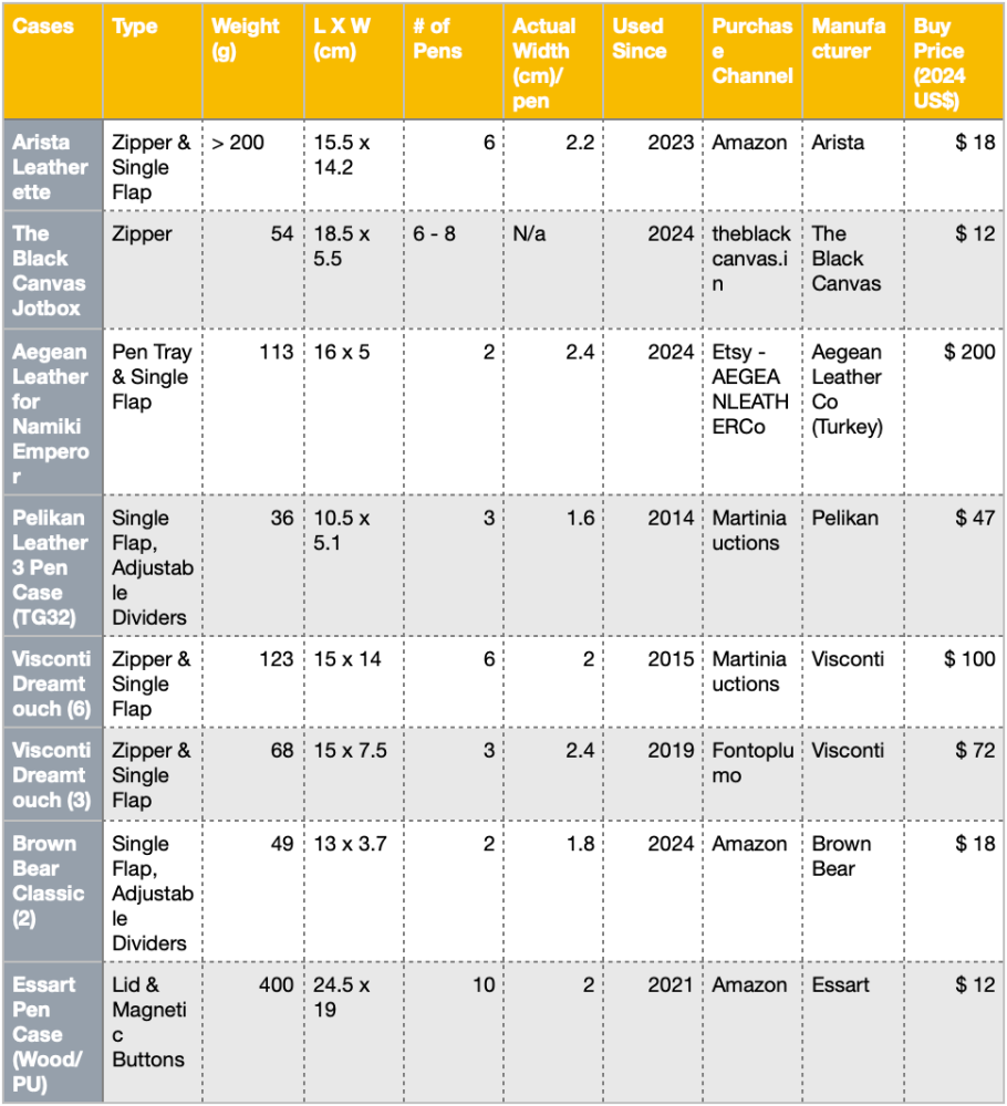 PRELUDE A search loop for the perfect ONE and then the more perfect OTHER With great fountain pens comes an even greater responsibility of carrying them around in this mortal world, where inadvertent scratches, dents, and corrosion become inevitable. Thus begins my search for sheaths and containers to protect these fine instruments, which have earned a reputation for being mightier than the sword; at least for the past 175 years. I digress; I wonder why the keyboard was never celebrated in the same way when it emerged around the same time as the original quote. If you like a pictorial blogger view, here is the link: A utilitarian review of my pen cases BACKGROUND AND OPINIONATED TRUTHS Experiments, measures and opinion I like to use a few fountain pens during my travels for note-taking and journaling. While I could use the original boxes for my limited collection, they tend to take up unnecessary space in my cupboard. Some of these cases are beautifully made, while others are more ordinary. That's where a storage pen case comes in handy. One advantage is that you can see multiple pens together to help with selection, or perhaps just to avoid making a choice. For example, I often tell my Opus 88 Jazz to just lie there, which has been my unfortunate treatment of that pen ever since I got it. In my case, the search has usually been for a value-for-money options. It’s rare to find a case that costs as much as a pen, but this highlights the absence of worthy alternatives. Another aspect is that in India, leather goods are available at a fraction of the cost compared to the West, although there is less general understanding of the premium quality of higher-grade leather materials. By a stroke of luck, a couple of us met Michael, a leather importer based in California, who sources leather from India, China, and Thailand. He supplies leather to some well-known premium brands, with the final products ranging from premium car seat covers to women’s bags. He explained what typically gets exported versus what is consumed domestically in these countries. Michael also described the leather qualities and grades he looks for when evaluating a shipment from the tanneries. By the way, you can check out some interesting expositions on leather grades and types , and here’s a brief write-up on leather quality if you’re short on time or patience: Full Grain: The highest quality. A cut of leather consisting of the outer layer of hide, left unsanded and unbuffed to retain its natural imperfections. It has a strong and durable surface. Top Grain: The top layer is sanded to remove imperfections, which reduces some of the strength and water-repellent qualities of full grain leather. It is commonly used in handbags, wallets, and shoes. Corrected: A broader term often referred to as genuine leather. It can be any layer of hide that has been treated to create a uniform surface. Commonly used in belts, wallets, bags, gloves, and shoes. Split Grain: A layer cut from the lower levels of top grain leather. It is not as dense, tight, or durable as full grain or top grain leather. Reconstituted & Recycled: Leather scraps are bonded together using polyurethane or latex. Here are a list of leather finishes: Aniline: Dyes allow natural surface of leather to show through. Semi-Aniline: Similar to aniline but with added pigments. Faux: Also known as PU, Vegan or Vinyl leather. Is made of polyurethane and made to mimic real leather. There are many more types (12+), but they may not be relevant to our search for pen cases and sleeves. Leather tanning is the process of treating hides to clean them of dirt, blood, and hair. This process alters the protein structure of the hide to make the leather durable and less susceptible to decomposition. Vegetable tanning: This method uses natural materials or tannins derived from plants and bark, which are astringents. It’s an ancient, environmentally friendly process. Chromium tanning: Chromium sulfate is used for a faster and cheaper tanning process, offering more color options than vegetable tanning. The hair and flesh are removed before the tanning process. Leather hides are graded as 1, 2, 3, or non-tannable, depending on the imperfections in the hide. The top-of-the-line branded pen cases are made from full grain cowhide leather with an aniline or semi-aniline finish. The case proliferation in my situation is rather proportional to the larger pen dimensions rather than the number of pens in my relatively limited collection. I found it increasingly inconvenient to carry flagship pens like the Wahl-Eversharp Decoband, Pilot Custom Urushi in the Pelikan TG32 three-pen case. While the Decoband fits inside Visconti Dreamtouch comfortably, the Custom Urushi does not. These pens could be a part of an everyday carry unlike a Namiki Emperor, unless you of course dare to carry it. In this situation, the Cross Leather Pen Box came to my rescue, but its dimensions pose a problem for my laptop bag if I want to carry two or three more standard pens. Given the rapid progress in design, manufacturing and evolving human desires, here are my standard set of guidelines, refined over the years, while looking for pen cases (YMMV): OBSERVATIONS & EXPERIENCE In Context Here are the pen cases I have acquired over the years: Single pen cases The Black Canvas Pen Capsule: Soft case. I got the English Violet variant which is made of top-grain chrome-tanned leather. The inside of the pouch is soft and velvety. Endless Companion Pen Pouch: Hard case. The company uses the term genuine leather which may indicate corrected leather. However, it seems well-made for standard pen sizes (such as a Lamy 2000, and it can stretch to fit a regular Montblanc 146) and has a matte buffed finish. The pen itself rests in a felt-like soft compartment, and the case is fastened by two buttons. They ensured that there is a felt-flap covering the exposed parts of a pen where it's buttoned. Cross Men's Leather Single Pen Box-Bl