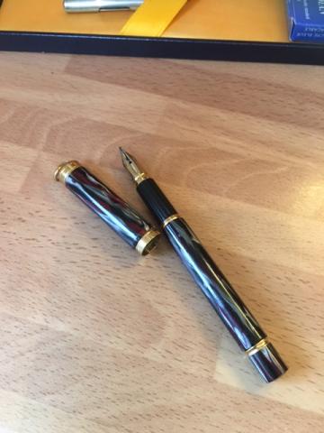 Here is my first ever review of a fountain pen,Waterman L'etalon. This expresses my own observations and comments about this pen and reflects my own experiance . I disclaim any association ,whether positive or negative with any person , firm , organization ,or group . FIRST IMPRESSION .I saw the pen about three yerars ago in the show case of a local shop of fancy items , and i was stunned with the beautiful look of this pen .I am not a particular fan of gold items but this particular pen catched me to the point of no escape, so I purchased it immidietly and filled and performed a writing test riget on the shop .At that time ,I did not know that it was the L'etalon. THE PRESENTATION .The pen was housed in a blue waterman contemporary box with white satin lining inside. The box was layed in an outer card -board sleeve. No accessories , no ink cartridges or bottle. CONSTRUCTION . The pen is made of solid brass i.e cap and barrel ,with a very beautiful engraved pattern ,called "basketveawe" pattern. It feels very nice to touch .The section is made of plastic with a thin golden ring near the nib and and a quite broader ring near the end of the section, with "waterman " and "france " inscribed on it ..The section screw is also made of brass wth gold polish.The cap has black plastic (or Onyx , I dont know !) flat cabachon ( for the lack of a better term ! )at the blind end .The upper and lower ends are plain .The end of cap meeting the barrel appears to have a ring and has a small hexagonal waterman logo and also engraved ""paris". The cap has a very nice blanc space for engraving ones name etc. The clip is beautiful ,roughly triangular in shape with a blanc cut in the middle .The barrel has flat circular golden disc attached at the end. THE NIB AND FEED.The nib is quite big keeping in proportion to the main body of the pen . .It is golden ,and shows engravings: waterman logo ,waterman , paris ,18 k 750 and some simple desgn . Interestingly, it has no breahther hole. The feed is also large resembling comb-cut pattern ,and shows engraving letter indicating the width of the nib . FILLING. The pen can be filled with cartridges or a waterman scew -type converter , which appears small in relation to the size of the pen. CLOSING /OPENING The pen opens and closes thru snap mechanism which is quite secure . WRITING AND PERFORMANCE.The fine nib on the pen is really smooth,and very close to my desire.In fact ,this nib draws consistent wet line as the ink-flow is very smooth .Writing with the pen is a very very pleasurable experiance. CONCLUSION.The pen is elegant ,beautiful and an excellent writer, and makes a treasured possession.The only " flaw " with the pen is that it is considerably hefty and it will take sometime for me to be "habitual" with this pen. But the heft is justified in its very name L'etalon ,a french alternative of "stallion" ,meaning a horse .This pen is solid ,sturdy and built to last and beautiful as well.It is unfortunate that the pen is no longer in production since 1996. '