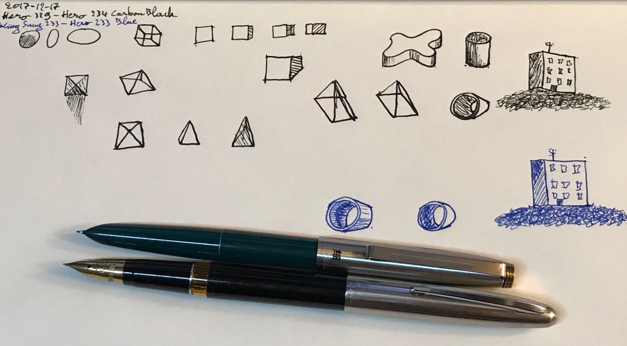 Tonight I've been practicing doodling with a Hero 329 inked with Hero 234 Carbon Black, and a WingSung 233 inked with Hero 233 Blue