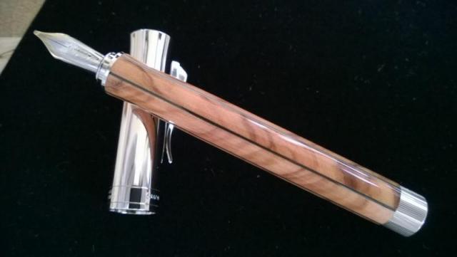 The barrel is made of cross-grained olive wood (Stimholz in German), where wood is cut into discs, perpendicular to the height of a tree. This renders both strength and elegance to the wood. You can notice some heavy varnishing on the barrel, so that any chance of staining is well-eliminated. The wood is said to be fitted onto the barrel in six individual elements, for the sole purpose of transforming it into a fountain pen. A contour of colours ranging from honey gold to reddish brown, garnish the barrel while the black lines running across the length of barrel give it a distinct elegance.