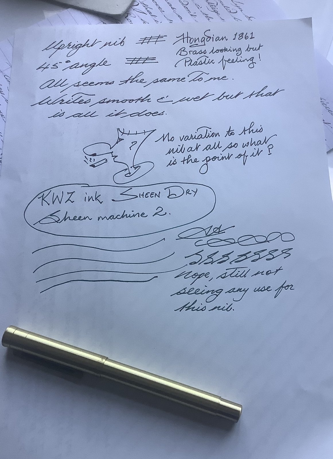 Hmm, does look a bit roller ball esq Stompie, thank you for the test page though, most excellent way of actually seeing the result, i do like a wet writer but probably because i like a fine nib, actually just tuned ( to some amateur degree ) a Fine Prelude that started life as a nail/needle, it is actually quite pleasant now and relatively quite and wet but like a lot of people, i am always on the hunt for that elusive... one, seems the Hong... thingy is probably not the ...one
