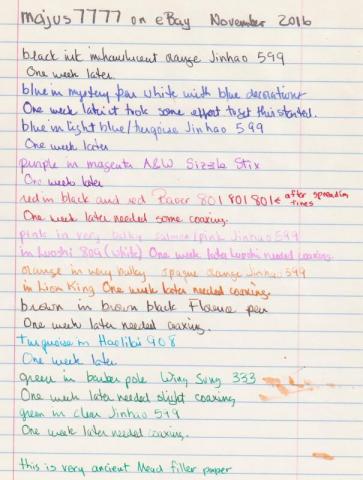 The inks are available in several forms but the really cheap option is packages of 30 cartridges. These are available from qdsupplies on eBay for $6.59, including shipping from England. That's about what you'd pay for half a dozen cartridges from a major pen manufacturer. Manuscript offers packages of all Black ink or two assortments. One is Black, Sepia, Red, Blue & Green, while the other has nine unnamed colors. I purchased the five-color assortment some time ago and include a comparison of that with another box purchased recently. Here are some more specifics, in an order to match the scan at the end.