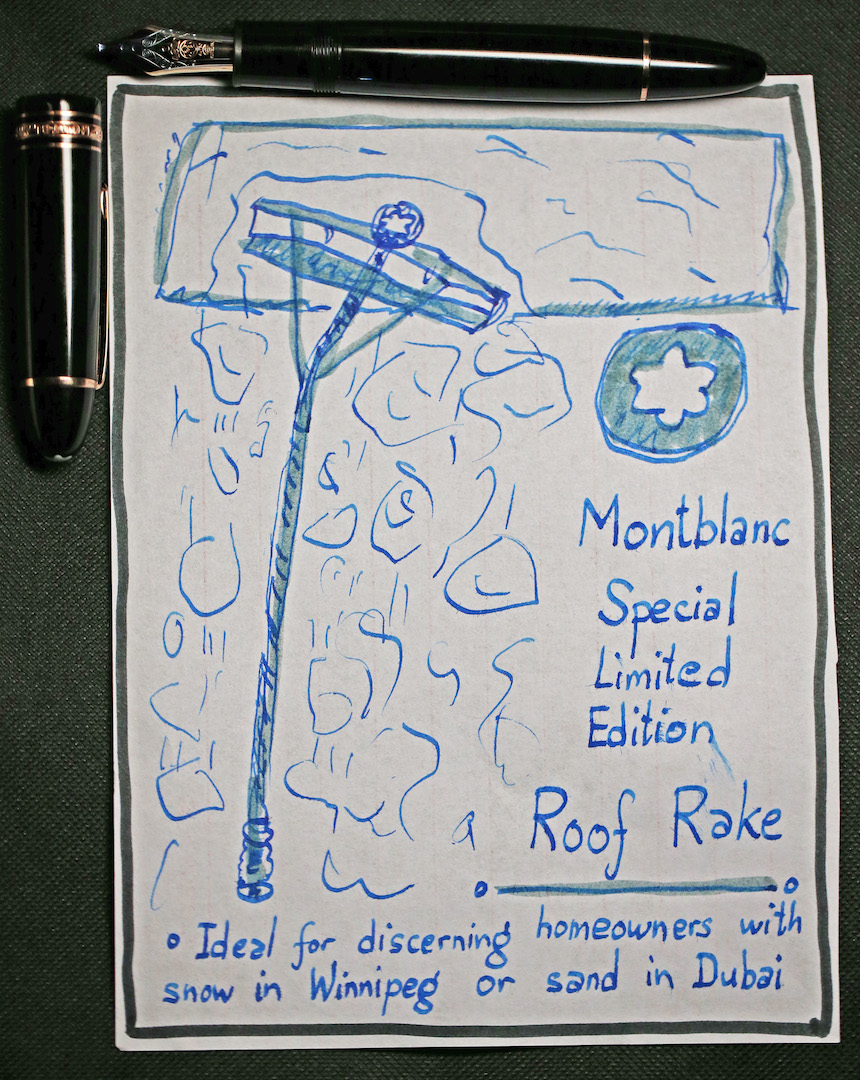 ~ The bespoke Montblanc OBBB roof rake is equipped with your choice of yellow gold, red gold or platinum support struts for the obliquely canted super-extra-broad blade, capable of effortlessly dislodging meter-high snowdrifts or heaped piles of desert sand.