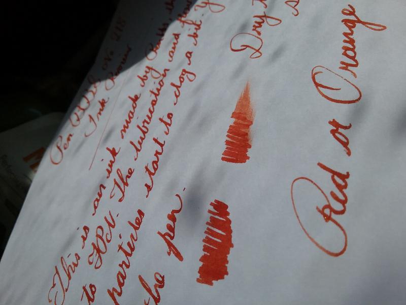 This is a review of an ink made by Penbbs, the Chinese FPN equivalent. It claims to be a red ink with gold glitter. It seems more deep orange to me. Well behaved and waterproof, no sheen and little shading but a very nice ink. I'm quite tempted to filter out the particles. I bought this from a seller on eBay. The glitter has a tendency to clog a little but not as badly as my experience of Diamine's shimmer inks. I put this in a demonstrator which may have been a little foolhardy but no signs yet of staining. The ink pulls away from the inside to reveal a clearness. If I find it does stain I will update this thread later. Please note that the scans make it look much more red than it actually is. It's more like a burnt orange.