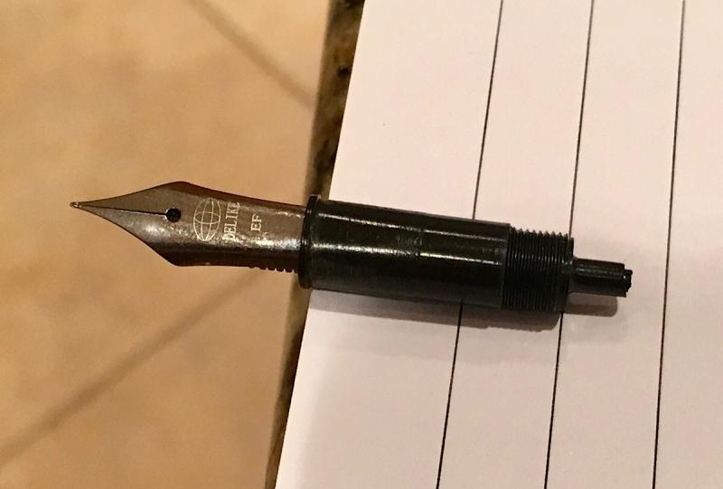 It uses the same screw-in nib unit the Delike Alpha and New Moon 2 so if you have any of those pens, you can easily swap nib units.