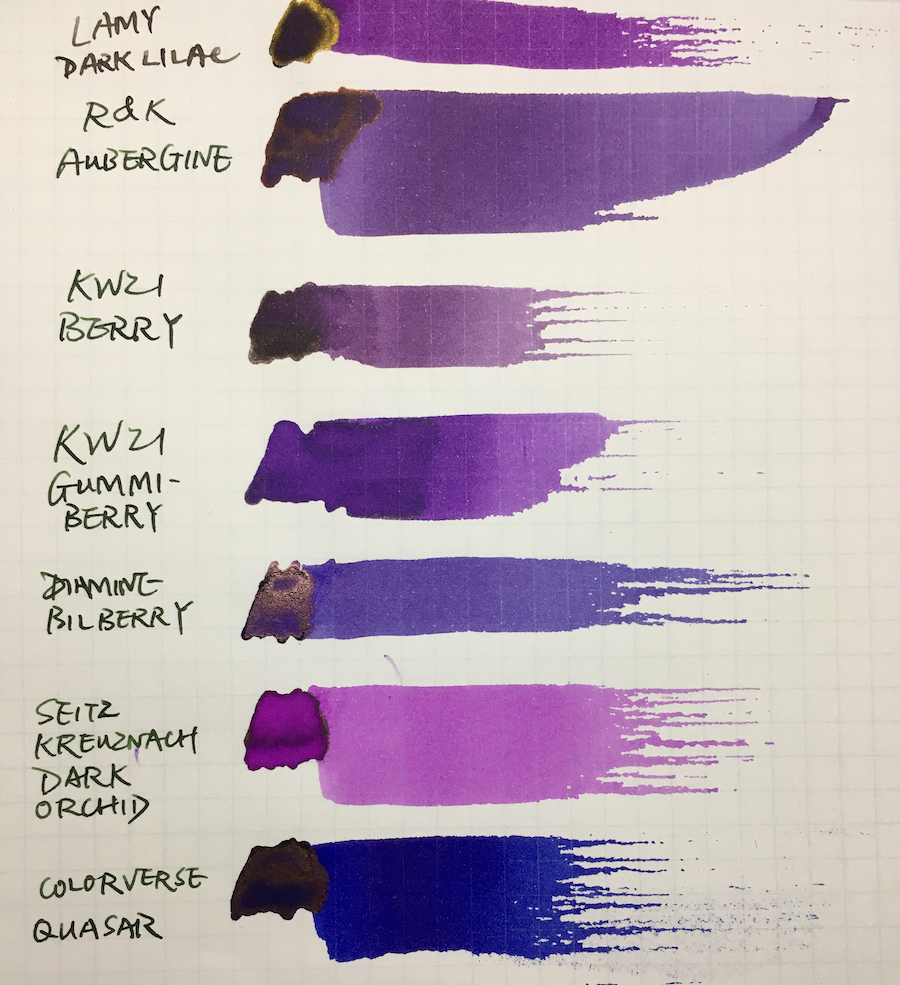 I’ve been using Aubergine for just over a week. A lovely grown-up shade of purple. No problems whatsoever in the pen; well-behaved and dries quickly on most papers. I think it’s quite different to Dark Lilac.