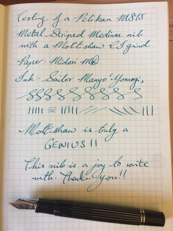 Finally got my M815 after being held up with the US Border Force - and it appears that Customs had ripped opened the brown paper wrapper that Nibs.com had wrapped over the pen box and had ended up as an accompanying scrumple. Thanks, but no thanks Border Force. Anyway, at least the accompanying bottle of Sailor Manyo Yomogi ink and its box wasnt in tatters.